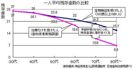 日本でも、予防歯科の第一人者である熊谷崇先生の調査によると、以下のグラフのように歯周治療をしっかり受けた方と受けなかった方とでは80歳になったときに約9本もの差がついているのです。皆さんは、80歳になったときに、何本、歯を残していたいですか?